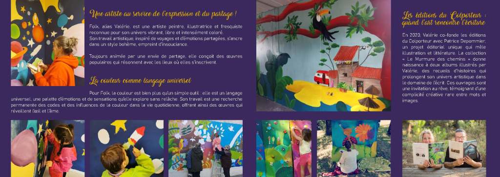 Folk a décidé d’apporter encore plus de couleurs à nos aventures en proposant ses fresques aux campings, cafés, mairies, centres de loisirs et écoles. Un festival de fleurs, d’oiseaux, d’arc-en-ciel et de soleils à découvrir sur son site : www.folketgipsy.fr.